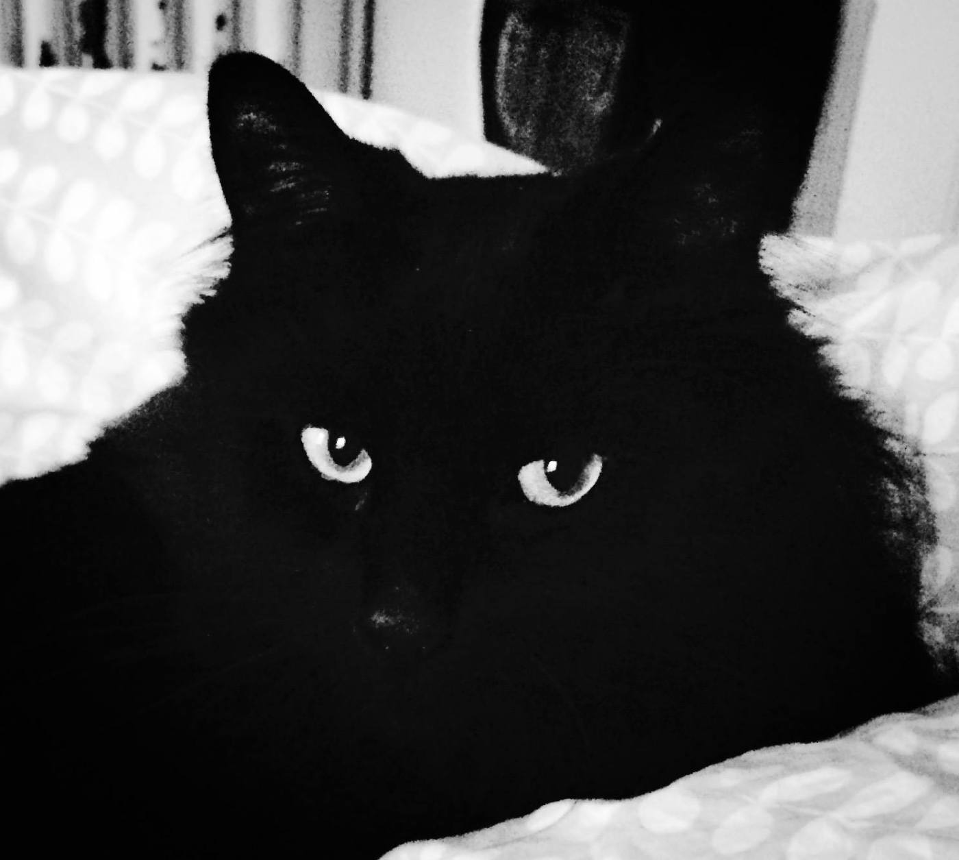 When I adopted him, his shelter name was Gator, a sign I chose to ignore. Instead, I focused on his gorgeous, jet-black mane, cartoonishly fluffy pantaloons, and tail so oversized that, attached to his otherwise stuntedly small body, makes him look a lot like a black squirrel. He’s a truly beautiful cat. Desi topped out at eight and a half pounds, so he’s what my husband and I call a “perma-kitten,” so light that he makes his big brothers seem enormous even though they are totally average. His feathery and feather-weight body make him incredibly tantalizing to hold and pet and kiss, which he then rewards with lightning-fast bites.